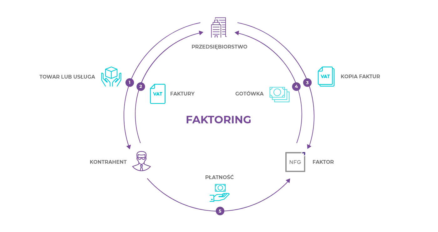 - Faktor, czyli wyspecjalizowana instytucja finansowa, taka jak NFG, która zajmuje się finansowaniem działalności przedsiębiorców. Wypłacamy Ci pieniądze na podstawie zgłoszonej przez Ciebie faktury.
